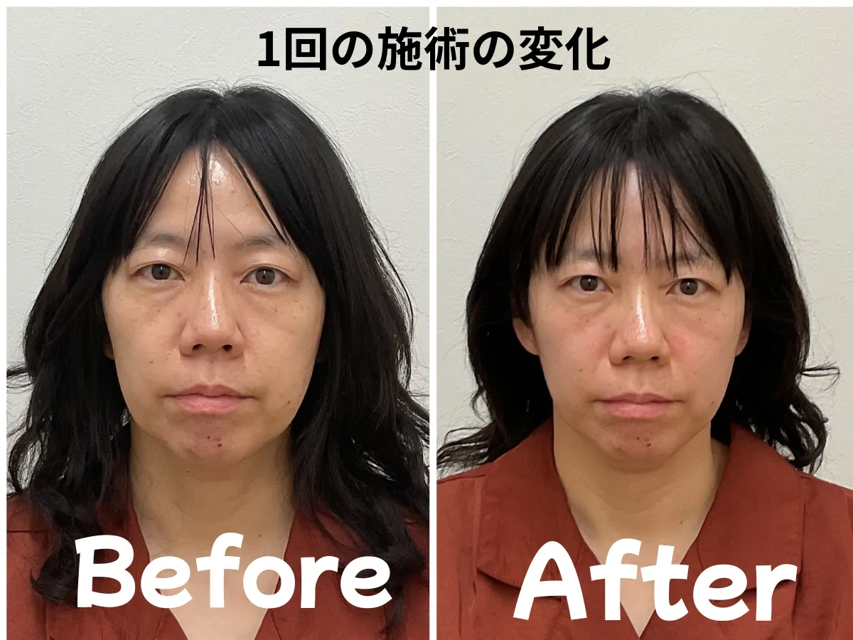 まずは、こちらの比較写真をご覧ください。1回の施術前後で、お顔の印象がこれほどまでに変わります。